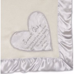 Features a silky embroidered heart and silk edging around the out skirts of the blanket