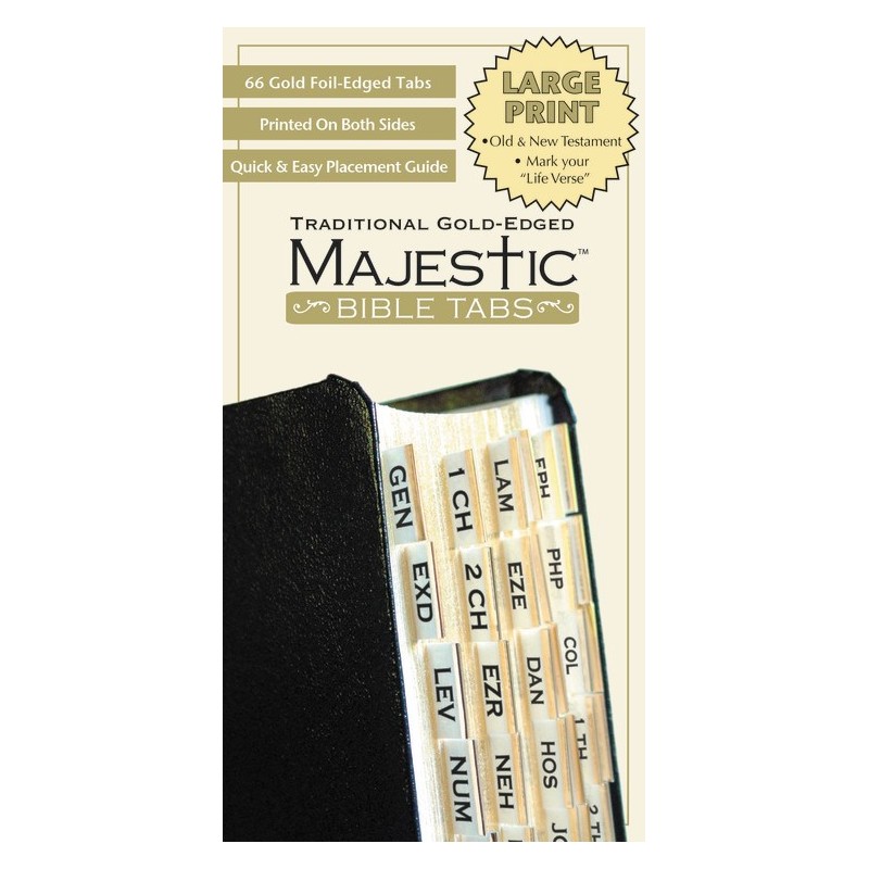Perfect for those who carry their Bible with a sense of style. Gold foil edges and large, easy-to-read print are a visually pleasing way to find favorite Scriptures. 84 gold foil-edged tabs for Bible from 7 inches up to 12 inches. Set includes: Old and New Testament tabs, special notation tabs and a Life Verse tab.