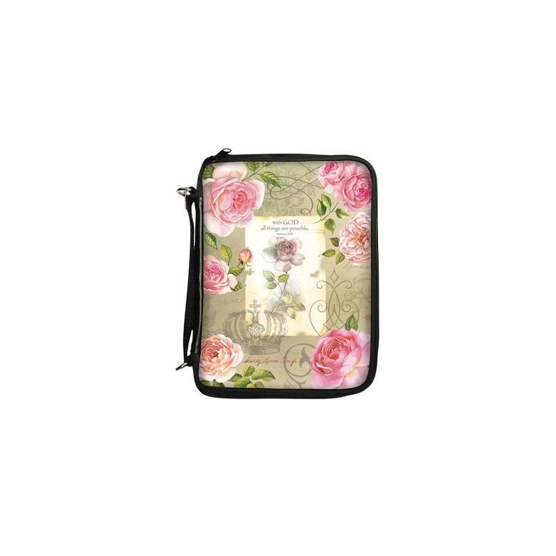 Classy black microfiber cover with vinyl front panel displays rose floral artwork and Scripture, With God all things are possible. Matthew 19:26. Front compartment zips open to reveal fold out organizer with pockets, mesh zipper pocket, pen loops, and card holder. Optional shoulder strap included; zip pocket on back. Will fit Bibles up to 9.5" x 6.5" x 1.75".