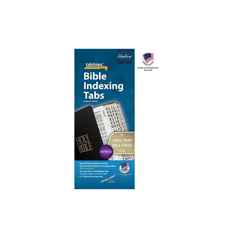 Tab any size Bible to find any book of the Bible faster. Pre-cut, permanent self-adhesive tabs, including Positioning Guide. Names of books are printed on both sides for easy reading and quick reference. TABBIES is family owned and operated since 1955. Made in USA