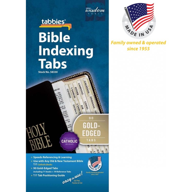Find any book in the Bible faster with Tabbies Bible Indexing Tabs. The names of the books are printed in clear easy-to-read type on both sides of the tab,so you can easily locate the exact book your"re looking for...a great help to Bible study, church readings or personal study. Self-adhesive tabs grip both sides of the page for durability, and are flexible to help prevent thin pages from tearing. Tabs are laminated and trimmed with rich gold or silver foil edges, enhancing the beauty of your Bible. Each set includes instructions and attaching guide.