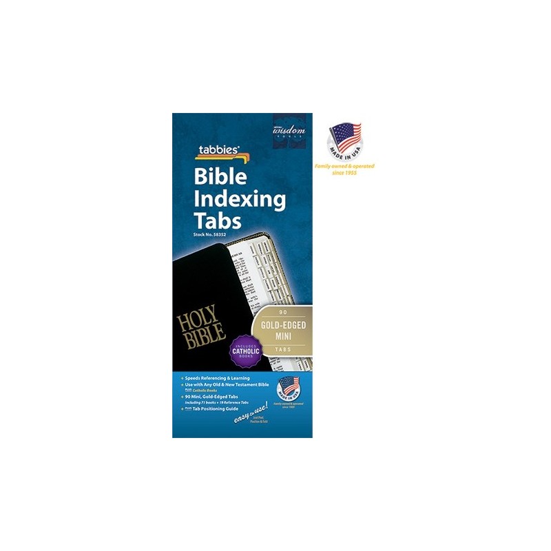 Tab any size Bible to find any book of the Bible faster. Pre-cut, permanent self-adhesive tabs, including Positioning Guide. Names of books are printed on both sides for easy reading and quick reference. TABBIES is family owned and operated since 1955. Made in USA