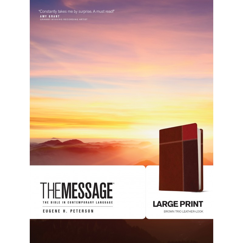 Enjoy the surprising clarity of The Message . . . with a font size to match.This large-print edition of The Message is designed for anyone who prefers larger type for clearer, more enjoyable reading.The Message is a reading Bible translated from the original Greek and Hebrew Scriptures by scholar, pastor, author, and poet Eugene Peterson. Thoroughly reviewed and approved by twenty biblical scholars, The Message combines the authority of Gods Word with the cadence and energy of conversational English.What makes The Message the best reading Bible? Discover for yourself. Enjoy the familiar one-column design, like books youre used to. Find passages with The Messages unique verse-numbered paragraphs. Relax with the large-print type size. See the big picture with The Story of the Bible in Five Acts, alongside handcrafted maps, charts, and timelines. Keep your place with a satin ribbon marker.Come and delight in the unexpected passion and personality that fill Gods Word.