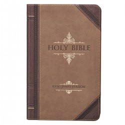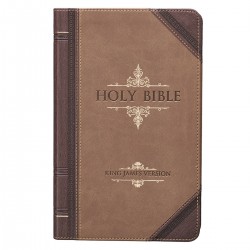 This traditionally styled, two-tone Faux Leather Bound Giant Print Standard Size Edition offers the classic King James Version in an easy to read 14 point giant print. The cover is constructed of quality man-made material with the look and feel of real leather (trade name LuxLeather). Design features include a two-tone look in dark brown and tan with contrast top-stitching, a debossed title, gold-foiled filigree design, gold gilt-edged pages and an attached ribbon page marker. Inside, you'll find reader-friendly subheadings, a double-column format, words of Christ printed in red ink, a helpful Scripture verse finder by topic and a one-year Bible reading plan. Size: 5 5/8" (W) x 8 3/4" (H) x 1 5/8" (D) Text Size 14pt 1806 Gold Gilt-Edged Pages Faux Leather Flexcover Bound Lay-Flat Spine Attached Ribbon Page Marker Words of Christ in Red Ink Footnote Verse Cross-Reference Guide Concordance Unique Scripture Verse Finder One-Year Bible Reading Plan 8 Full-Color Maps Presentation Page
