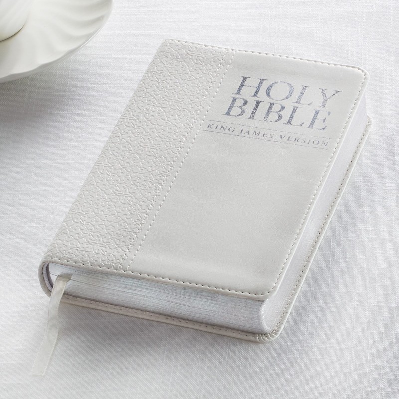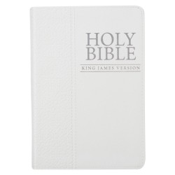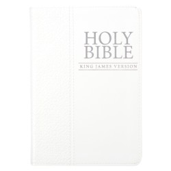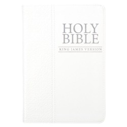 This pure white King James Version Pocket Edition is a lovely gift Bible. Its cover is constructed of quality man-made material imported from Italy, with the look and feel of real leather (trade name LuxLeather). Design features include a debossed decorative motif with silver foil cover title and silver gilt-edged pages. Inside, you'll find a helpful Scripture verse finder, reader-friendly subheadings, a double-column format, a one-year Bible reading plan and an attached ribbon page marker.