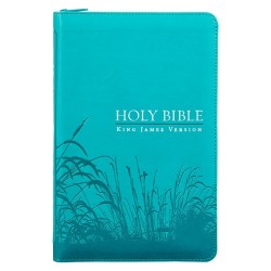 This beautifully designed Turquoise Faux Leather Bound King James Bible zips up for a built in Bible Cover. The cover is constructed of quality man-made material imported from Italy, with the look and feel of real leather (trade name LuxLeather). Design features include a striking engraved motif, contrasting white debossed title, silver gilt-edged pages with thumb indexing and an attached ribbon page marker. Inside, you'll find reader-friendly subheadings, a double-column format, words of Christ printed in red ink, a helpful Scripture verse finder by topic and a one-year Bible reading plan. 1002 Pages. Text Size 9pt 1002 Silver Gilt-Edged Pages Faux Leather Flexcover Bound Zipped Closure Thumb Indexing Lay-Flat Spine Attached Ribbon Page Marker Words of Christ in Red Ink Unique Scripture Verse Finder One-Year Bible Reading Plan
