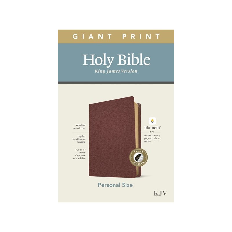 Bible Reading: IlluminatedThe new Tyndale KJV Personal Size Giant Print Bible, Filament-Enabled Edition, has readable text and an attractive layout in an easy-to-carry size. And while it has the same low price as basic, text-only Bibles, the KJV Personal Size Giant Print Bible offers much more. Along with the trusted and revered King James Version (KJV) text, it also includes the groundbreaking Filament Bible app, which turns this Bible into a powerful study and devotional experience, offering more to expand your mind and touch your heart than you can possibly hold in your handat no additional cost, no additional bulk or weight. Read this Bible on its own, or dig deeper with the Filament Bible app. Use your mobile phone or tablet to connect every page to a vast array of related content, including:25,000 study notes350+ videos40+ maps and infographics400+ profiles and articles1,500+ devotionalsLibrary of worship musicSpecial features include:New, easy-to-read page designsFilament content linked to every page!Readable large printHandy thin sizeWords of Jesus in redQuality lay-flat Smyth-sewn bindingTyndale Verse FinderPresentation pageRibbon markerGilded page edges