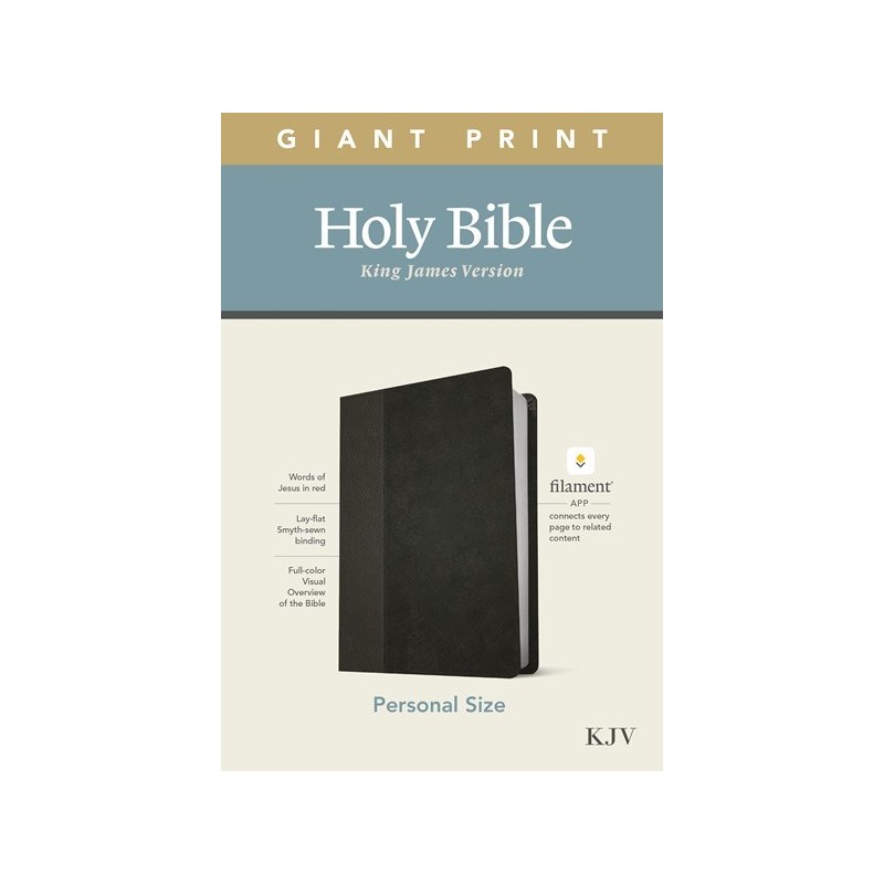 Bible Reading: IlluminatedThe new Tyndale KJV Personal Size Giant Print Bible, Filament-Enabled Edition, has readable text and an attractive layout in an easy-to-carry size. And while it has the same low price as basic, text-only Bibles, the KJV Personal Size Giant Print Bible offers much more. Along with the trusted and revered King James Version (KJV) text, it also includes the groundbreaking Filament Bible app, which turns this Bible into a powerful study and devotional experience, offering more to expand your mind and touch your heart than you can possibly hold in your handat no additional cost, no additional bulk or weight. Read this Bible on its own, or dig deeper with the Filament Bible app. Use your mobile phone or tablet to connect every page to a vast array of related content, including:25,000 study notes350+ videos40+ maps and infographics400+ profiles and articles1,500+ devotionalsLibrary of worship musicSpecial features include:New, easy-to-read page designsFilament content linked to every page!Readable large printHandy thin sizeWords of Jesus in redQuality lay-flat Smyth-sewn bindingTyndale Verse FinderPresentation pageRibbon markerGilded page edges