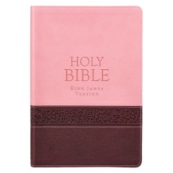 Striking Pink & Brown Faux Leather Bound Large Print Edition King James Bible. The cover is constructed of quality man-made material with the look and feel of real leather (trade name LuxLeather). Design features include an engraved filigree cover design wrapped front to back, debossed title, contrast stitching, gold gilt-edged pages and an attached ribbon page marker. Inside, you'll find reader-friendly subheadings, a double-column format, words of Christ printed in red ink, a helpful Scripture verse finder by topic and a one-year Bible reading plan. Text Size 11pt Fits in Christian Art Gifts Large Size Bible Cover 6 5/8 x 9 5/8 x 1 1/8 Inch 1002 Gold Gilt-Edged Pages Faux Leather Flexcover Bound Lay-Flat Spine Attached Ribbon Page Marker Words of Christ in Red Ink Unique Scripture Verse Finder One-Year Bible Reading Plan