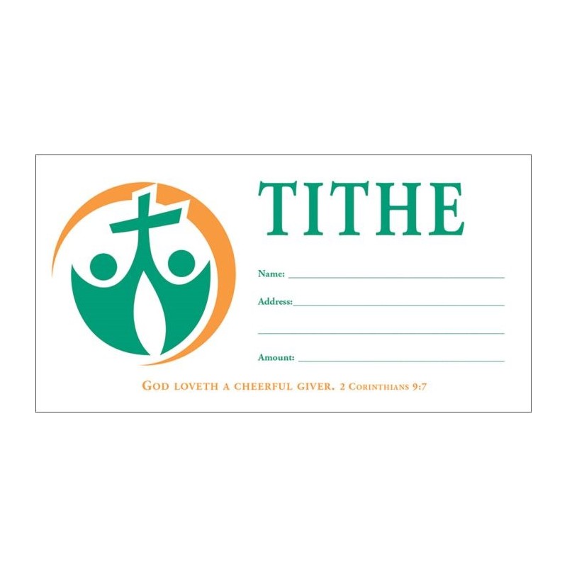This value-priced offering envelope shows an image of a church and words "Tithe" along with scripture, God Loveth A Cheerful Giver, 2 Corinthians 9:7 (KJV). Offering envelopes arrive shrink-wrapped in a package of 100's (6.5"x3.5"). Includes lines for name, address, and the amount enclosed on front.