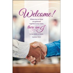 Welcome (Matthew 18:20, KJV) regular size bulletin features the Scripture verse Matthew 18:20 (KJV): Where two or three are gathered together in my name, there am I in the midst of them. The bulletin is shown folded (8.5" x 5.5"), exactly as church members and guests will receive it. Worship bulletins arrive packaged flat 8.5" x 11" to fit into your printer or copier; shrink wrapped in packages of 100.