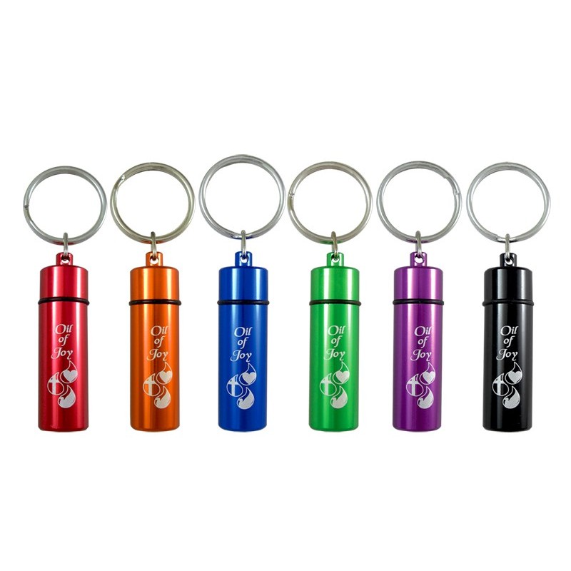 Oil of joy vials have rubber gaskets and split key rings. The oil of joy graphic is laser engraved and comes in assorted colors. 2 3/4 inches long.