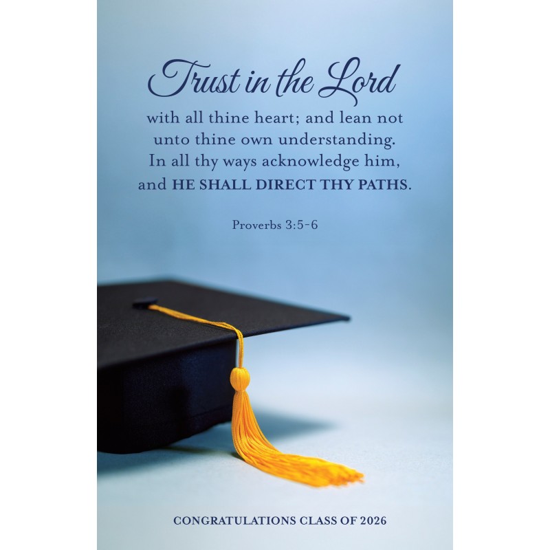 This Broadman Church Supplies Graduation Bulletin is adorned with a beautiful 4-color image and is designed for use during a Graduation celebration service any time of the year. The featured verbiage is Proverbs 3:5-6 from the KJV translation of the Bible. All Broadman Church Supplies bulletins are sold in packages of 100 bulletins. A free downloadable template to help set up the layout of information to be printed on the bulletin is available at www.bhpublishinggroup.com/supplies-templates/.