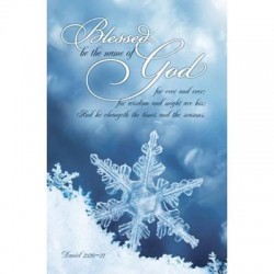 Blessed Be the Name (Daniel 2:20-21, KJV) regular size bulletin features winter scenery and the Scripture verse: Blessed be the name of God for ever and ever: for wisdom and might are his: And he changeth the times and the seasons. Daniel 2:20-21 (KJV). The bulletin is shown folded (8.5" x 5.5"), exactly as church members and visitors will receive it. Worship bulletins arrive packaged flat 8.5" x 11" to fit into your printer or copier shrink wrapped in packages of 100.