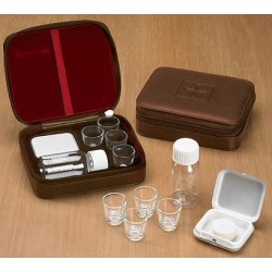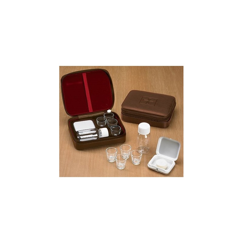 Stamped Cross on Leather-Look Cover Velveteen Lined Glass Cups Aluminum Host Box 1.6 oz. Juice Bottle Includes 4 glass cups, 1.6 oz wine/juice bottle, aluminum container for hosts. In a leather-look box with a zipper closure. Glass -- 5 7/8" x 5" H