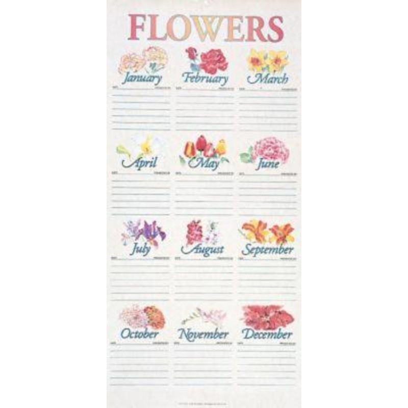 Perfect for organizing your information in visual form, this attractive Flower Chart is used for recording the names of persons presenting altar flowers. Each month includes six ruled lines for easy writing, with beautiful flower designs over each month, and words "Date" and "Presented By" under name of month; 31" x 15", Mylar reinforced and safely shipped in a mailing tube to prevent creases.