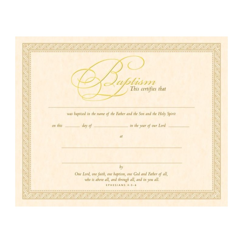 Text BAPTISM This certifies that (blank line) was baptized in the name of the Father, the Son and the Holy Spirit on the (blank line) day of (blank line) in the year of our Lord (blank line) at (blank line) (blank line) by One Lord, one faith, one baptism, one God and Father of all, who is above all, and through all, and in you all. Ephesians 4:5-6