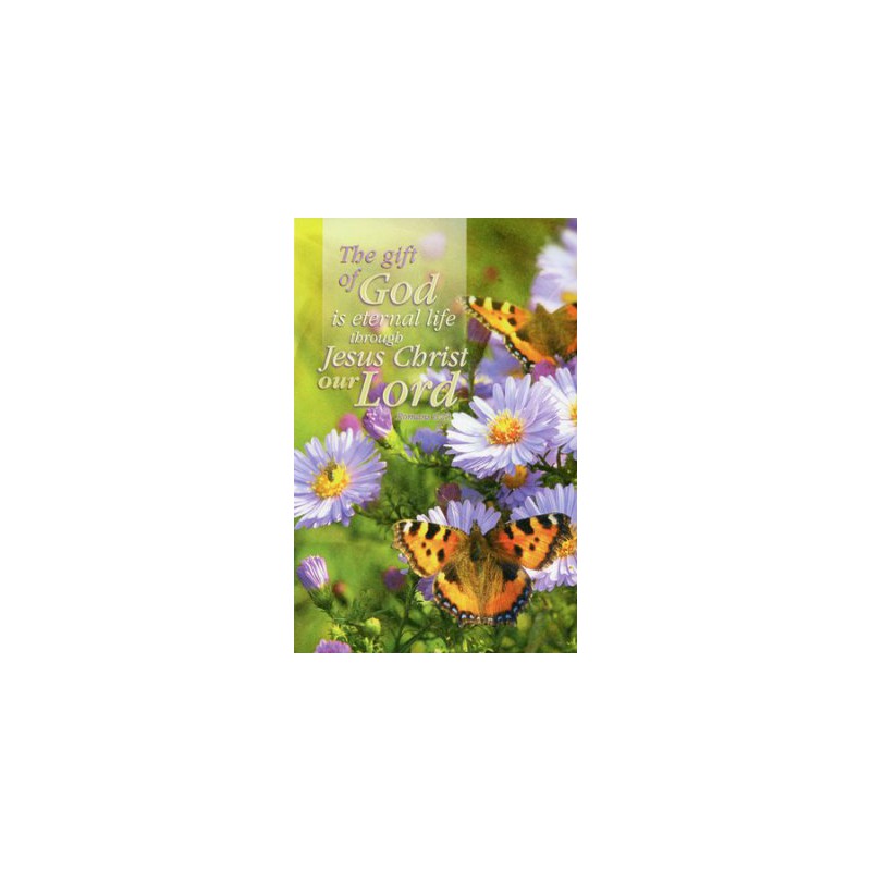 The Gift of God is Eternal Life bulletin is shown folded (8.5" x 5.5"), exactly as church members and visitors will receive it. Worship bulletins arrive packaged flat 8.5" x 11" to fit into your printer or copier; shrink wrapped in packages of 100.