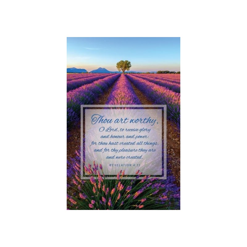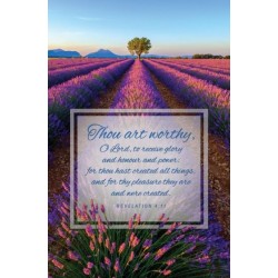 Share a message of praise toward God to your readers with this bulletin. The image displays a vivid lavender field with a strong tree in the background. Revelation 4:11 (KJV) complements the image in a cursive font: Thou art worthy, O Lord, to receive glory and honour and power: for thou hast created all things, and for thy pleasure they are and were created. This standard size bulletin is blank on the inside and back for your information. Fits all copiers and printers.