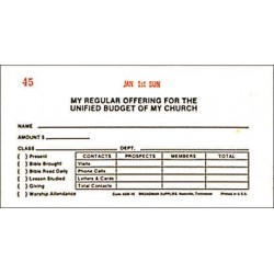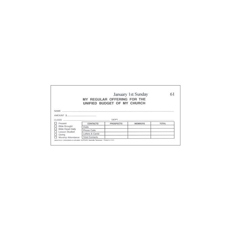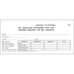 Boxed sets of envelopes are helpful for church workers to keep records of congregational giving. Each envelope is dated according to the numerical order of the Sundays of the month: January 1st Sunday, January 2nd Sunday, etc. These envelopes are bill sized and open at the top. Lines are provided for Name, Amount, and Sunday School information. 53 envelopes include an initial offering to defray the cost of the box.