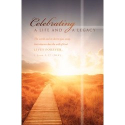 Celebrating a Life and Legacy regular size bulletins feature the Scripture verse 1 Corinthians 13:12 (NIV): The world and its desires pass away, but whoever does the will of God lives forever. The bulletin is shown folded (8.5" x 5.5"), exactly as church members and visitors will receive it. The back side is blank to include the information you choose. Worship bulletins arrive packaged flat 8.5" x 11" to fit into your printer or copier; shrink wrapped in packages of 100.