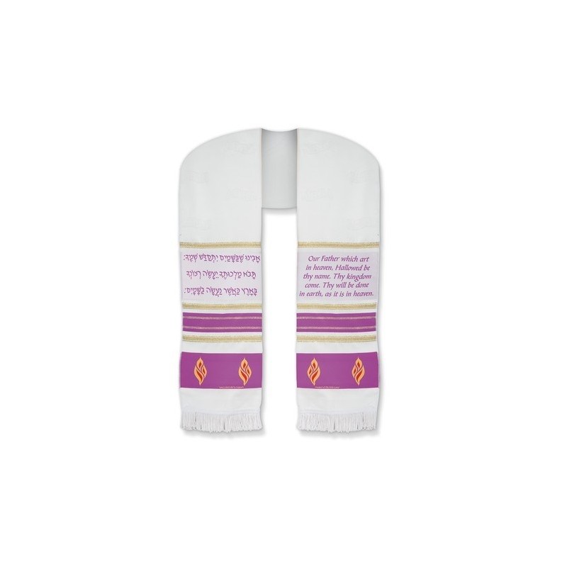 Lords Prayer Scarf, Purple Size 63" x15" Hebrew and English The "Lords Prayer" scarf-for praying-Blue, White, Gold acrylic-63 x 15 The Lords Prayer, "Our Father which art in heaven. Hallowed be thy name. Thy kingdom come. Thy will be done in earth, as it is in heaven...(Matthew Matt 6:9-10)" is printed on it.