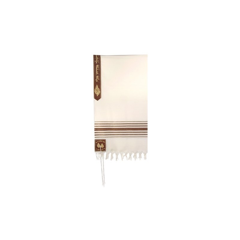 The Prophet Elisha Tallit This brown striped prayer shawl has the double flames that say in Hebrew - Shema Yisrael "Hear Oh Israel" on the four corners. The Hebrew over the flames on the corners say "Elijah went over to Elisha and threw his mantle on him" This is also in Hebrew on the Atarah (collar) The Hebrew below the flames says "Let a double portion of your spirit be on me"