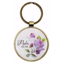Purple Floral Design, Be Still and Know Collection, 1-Inch Split Metal Ring, Epoxy-Filled Front with Scripture - Psalm 46:10, Stamped Metal Back, Durable Matte Tin Gift Box with Full Color Design, Embossed Cross Design On Gift Box Lid, Tin Size: 4.4" x 2.7" x 0.8" (112 x 69 x 20mm), Keyring Size: 3" x 1.75" (77 x 45mm