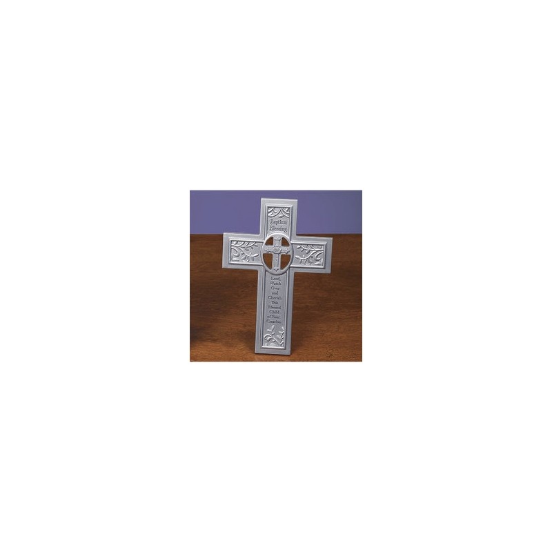 Resin cross features a raised design, etched sentiment, cut-out detail and striking silver-painted finish. Ready to hang; or stand with attached easel backer. 5 3/4" x 8 5/8".