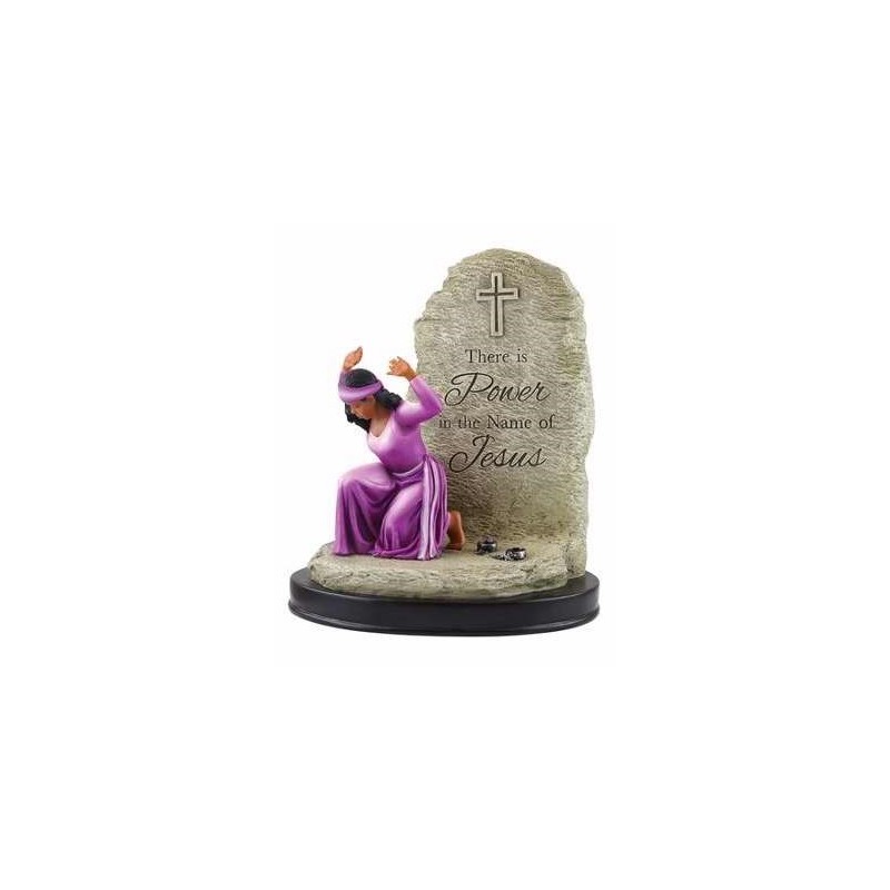 Detailed figurine of woman kneeling in pink gown with hands held up; an expression of faith and inspiration. Round base with stone detail, engraved There is power in the name Jesus with cross. 6.25" x 7.5" x 3".