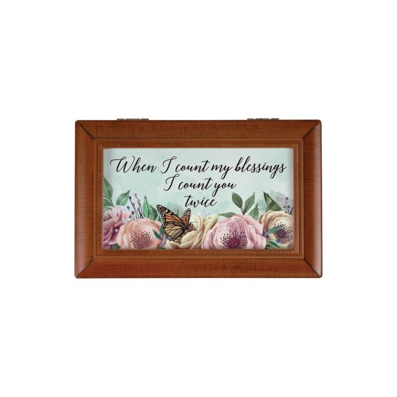 Music box is velvet lined, includes a hand crank music mechanism and plays a popular song! All sentiment cards can be replaced with a personal photograph. Plays "Moonlight Sonata"
