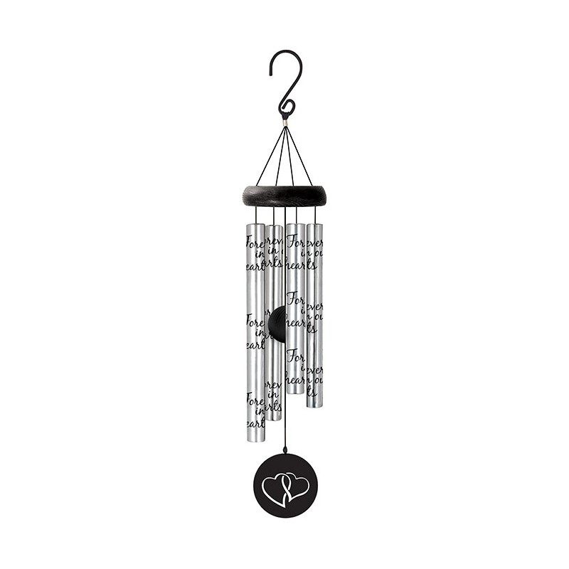 21" sonnet chimes have 4 heavy walled, center pinned tubes that emit sweet gentle tones. All aluminum construction, durable powder coated and anodized finish, and strung with industrial cord. Each chime has an adjustable striker. Tubes are 3/4" diameter, sentiment is printed directly onto the tubes.