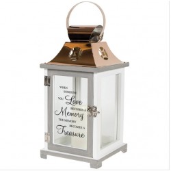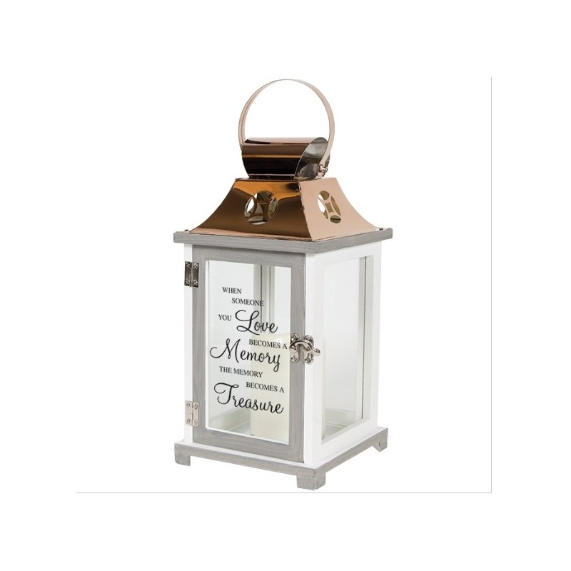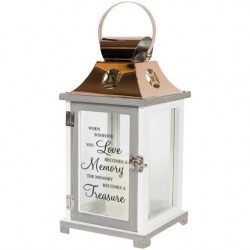 Our Light The Way Memorial Lanterns are made from quality composite wood and a stainless steel copper finish top. They feature a built-in automatic timer which runs for 6 hours on and 18 hours off(3-AAA batteries are NOT included) and are inscribed with sentimental quotes. DO NOT use fire burning candles in the lanterns. Suitable for hanging or free-standing use inside or outside. Recommended as an accent in floral arrangements for many occassions!