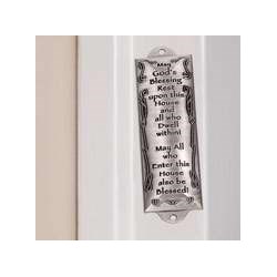 Pewter mezuzah in brushed finish with words of blessing for all and raised swirl trim. May God's blessing rest upon this house and all who dwell within! May all who enter this house also be blessed!