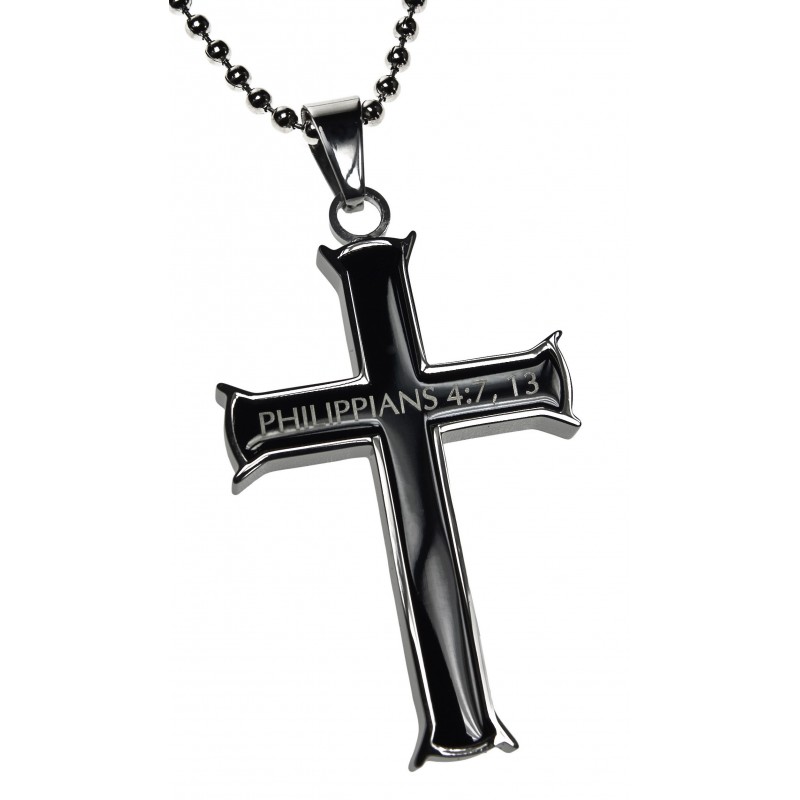 Solid Stainless Steel cross with high polish finish outer casing and ebony middle. Front and back Scripture is electroplated into the cross. Cross size 1 3/4 x 1".