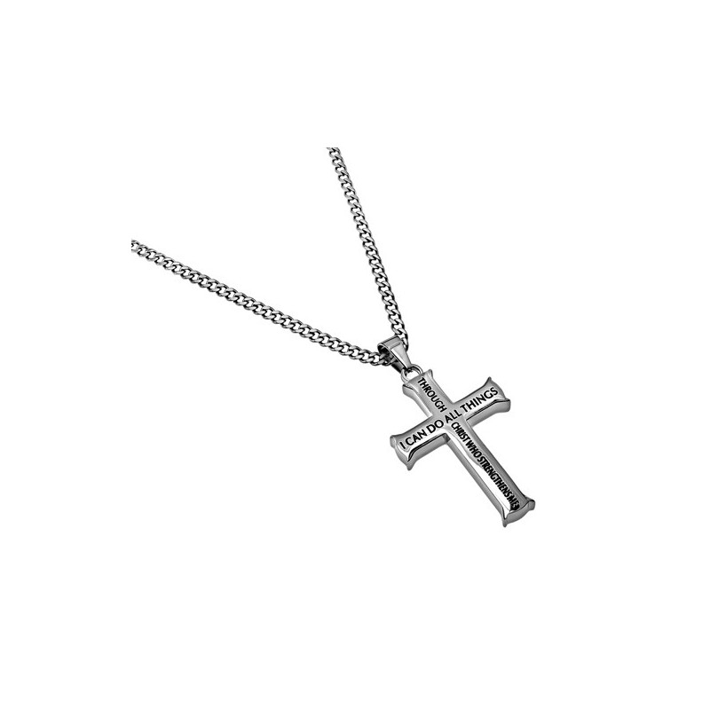 Solid Stainless Steel cross with high polish finish. Front and back Scripture engraving with black filling. 20" length high polished 316L stainless steel curb chain