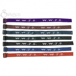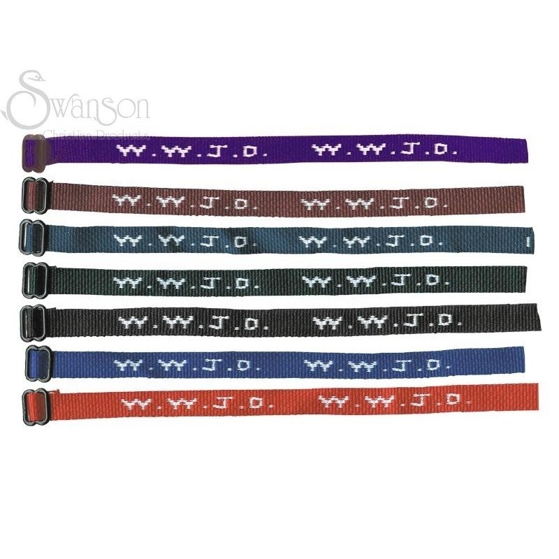 WWJD (What Would Jesus Do) Woven Wristlets with slide buckle. Colors include: Purple, Maroon, Delta Blue, Forest Green, Black, Royal Blue, and Red. Great for people of all ages! Bring these to VBS, AWANA, Birthday Parties, etc! Great conversation starter!