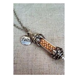 Pendant includes a vial of actual mustard seeds, along with a small dog tag that has the word "Faith" inscribed on one side, and the Hebrew word for faith on the other side.