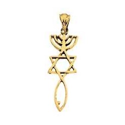 Necklace: Gold-Plated Roots Pendant With chain (approximately 18") The pendant consists of a 7 Branched Menorah, a Star of David, and a Fish is approximately 1 3/8" long.