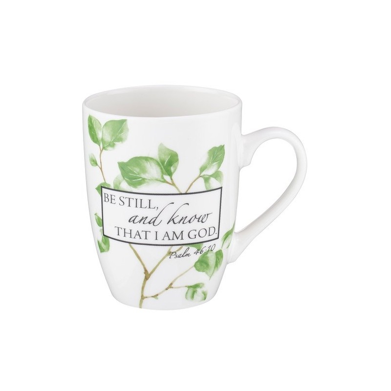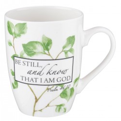 The white ceramic Be Still Coffee Mug features Be still, and know that I am God with a delicate green leaf pattern. The ceramic coffee mug holds 12 fluid ounces and is the perfect height for personal use coffee brewing systems. The mug arrives in a packaged gift box, making this a cherished gift for any occasion. Capacity: 12 fl oz (360ml) Ceramic Mug Microwave Safe Tested for Lead Packaged in a Gift Box