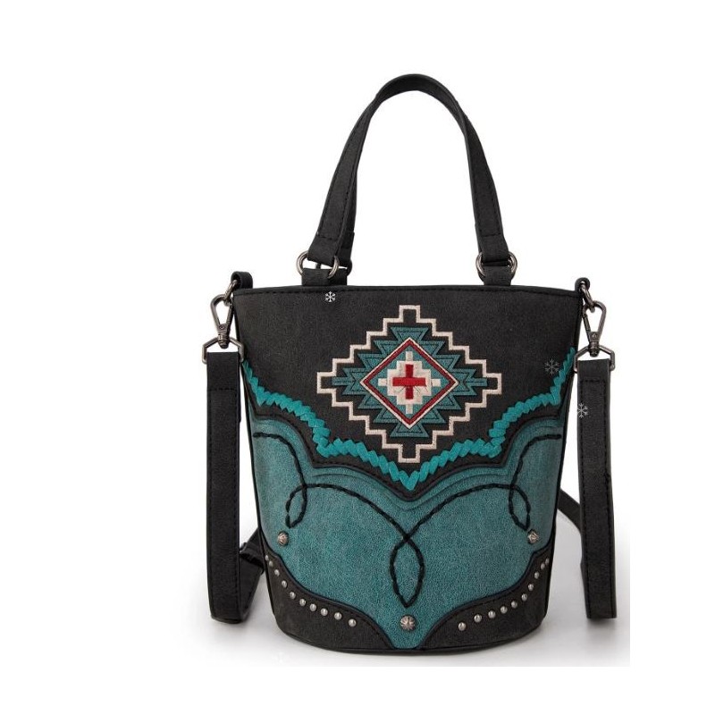 Bucket Tote/Crossbody Bag-Aztec Cross-Black