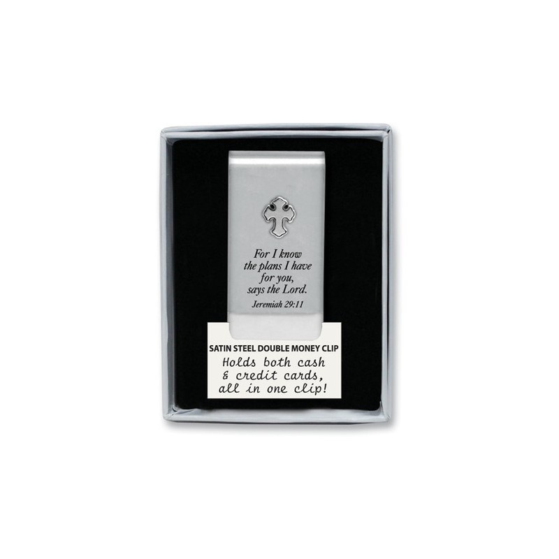 Cross money clip of satin steel features double clip to hold both cash and credit cards. Approximately 2"; with Scripture verse from Jeremiah 29:11 For I know the plans I have for you, says the Lord. Boxed for giving; practical gift keepsake.