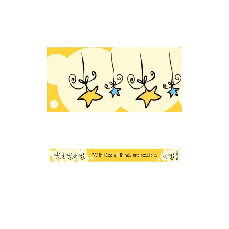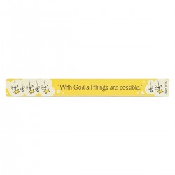 Flanked by happy hanging stars this bright magnetic strip is an uplifting reminder that with God all things are possible. Each magnetic strip is printed in full color and laminated, with a full magnetic backing. Use these magnets on white boards or metal surfaces like doors, desks, shelving or bins - any place a little inspiration is needed.