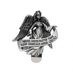 Reads "Never drive faster than your guardian angel can fly" Attach to your car or truck visor to hold papers and bring protection in your travels Comes carded on a 3 by 4 inch card High quality pewter material; includes clip on back