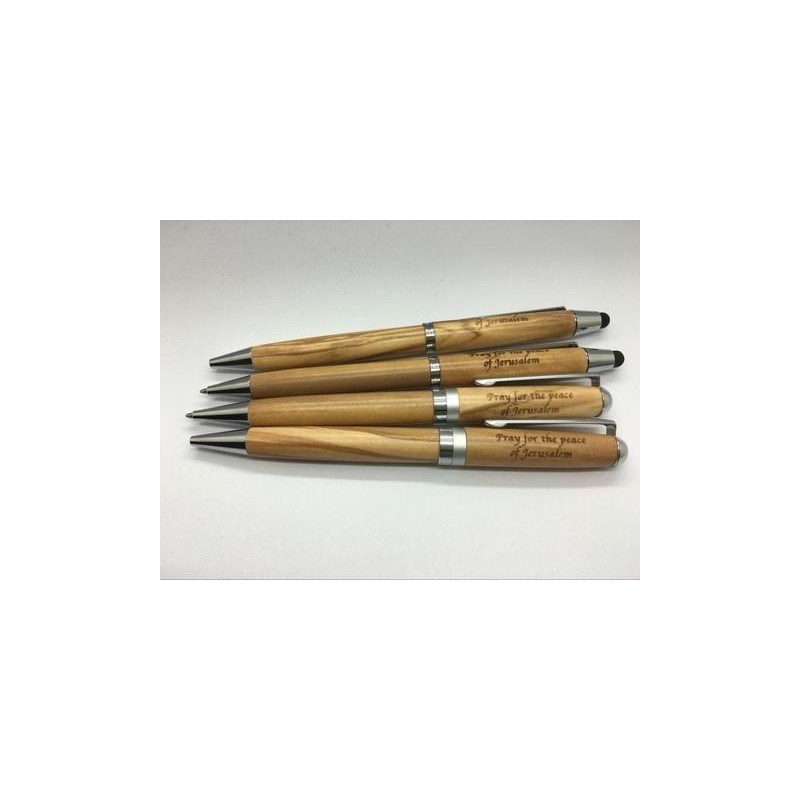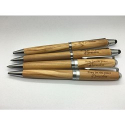 Pray for the Peace of Jerusalem is etched onto pens made of Olivewood.