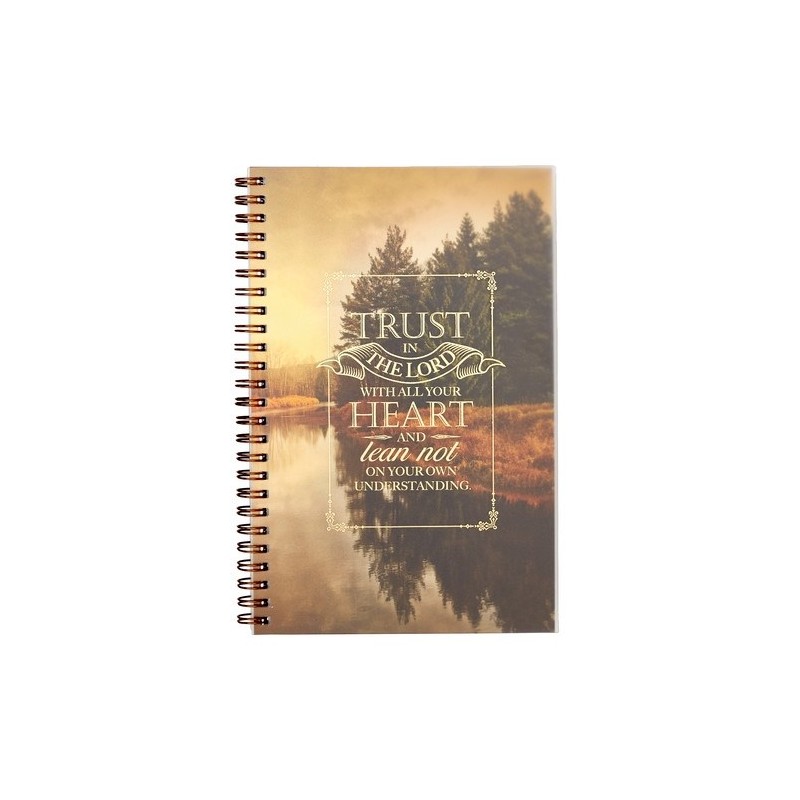 The Trust In The Lord Notebook is wirebound with a gold spiral bound coil, making it convenient to turn each page of the Christian notebook and read a fresh Bible verse at the bottom of the page. Featuring a PVC cover with cardstock, this Christian gift features a lovely river scene on the cover, allowing the writer to rest their eyes on a serene image and the Proverbs 3:5 verse. Size: 5 1/2" (W) x 8 1/2" (L) PVC Cover with Cardstock Gold Spiral Bound Coil 128 Lined Pages Wirebound Scripture at the Bottom of Each Page Proverbs 3:5 Verse on Cover Self-seal Bag Packaging