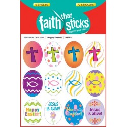 Easter-egg shaped colorful foil stickers are decorated with symbols and sayings that reflect the true meaning of the holiday: Cross, Ichthus (Christian fish), Happy Easter, and Jesus is Alive. Kids will love decorating eggs, crafts, placecards, nametags, and more. Approximately " x 1" each. Six sheets, 12 stickers per sheet; 72 stickers per package.