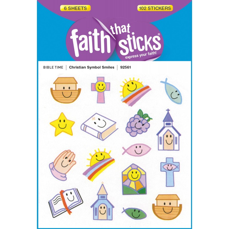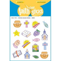 These fun little stickers show Christian symbols that will bring a smile to the face of any boy or girl. Each of the 17 symbolsincluding Bible, star, ark, church, fish, and morehas a charming smiley face design. Approximately "" x "1" each. Six sheets, 17 designs per sheet; 102 stickers per package.