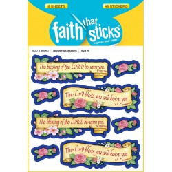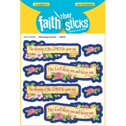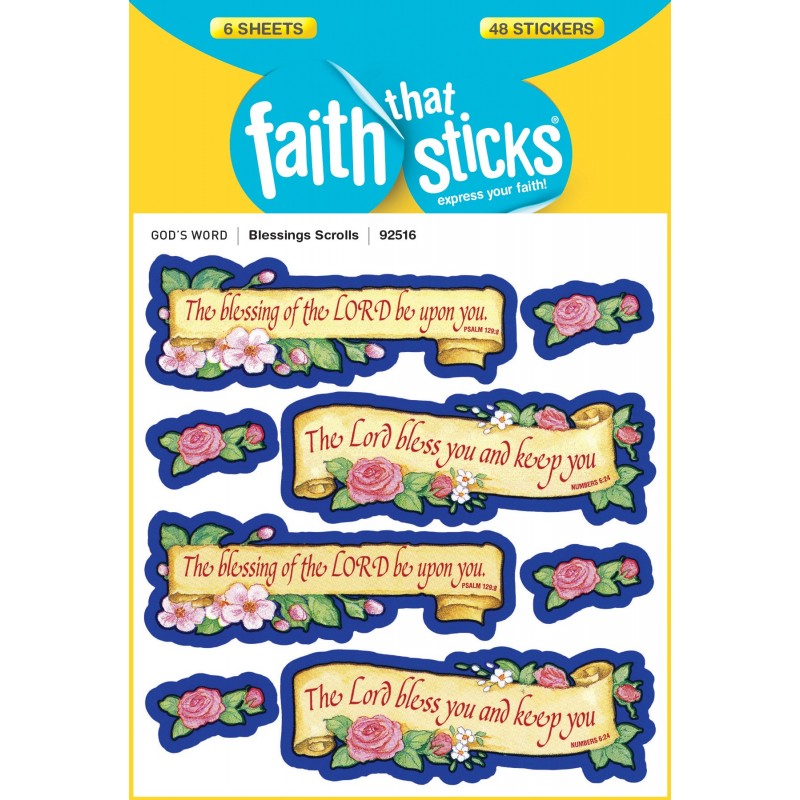 Scroll-shaped stickers feature two classic blessings from the Bible: The blessing of the Lord be upon you. The Lord bless you and keep you. A perfect send-off from church or Sunday school, four large stickers (2" x 1") have verse and flowers, plus each sticker sheet also has four small rose stickers. Six sheets, 8 stickers per sheet; 48 stickers per package.