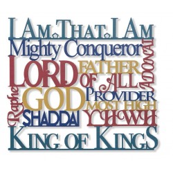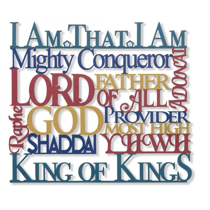 Beautiful, multi colored painted steel cut out featuring ten Names of God. It makes a great, colorful addition to any room, and serves a great reminder of His presence. Item No. 21122
